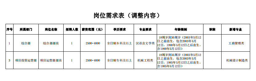 四、增加招聘數(shù)的崗位:項目工程部部員(項目管理類)(原2名調(diào)整為3名);融資財務(wù)部部員(會計學(xué),初級會計師)(原1名調(diào)整為2名);融資財務(wù)部部員(工商管理類、金融類,全日制本科及以上)(原1名調(diào)整為2名)。