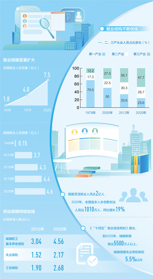 改革開(kāi)放以來(lái),我國(guó)積極應(yīng)對(duì)就業(yè)新形勢(shì),努力實(shí)現(xiàn)了就業(yè)大局的基本穩(wěn)定。70多年接續(xù)奮斗,我國(guó)夯實(shí)了就業(yè)基礎(chǔ)。到2019年,我國(guó)就業(yè)規(guī)模增加到7.7億人,與1949年相比增幅達(dá)330.3%,高出同期全國(guó)總?cè)丝谠龇?72%。到2020年末,全國(guó)就業(yè)規(guī)模達(dá)7.5億人。2021年1—9月,全國(guó)城鎮(zhèn)新增就業(yè)達(dá)到1045萬(wàn)人,完成全年目標(biāo)任務(wù)的95%;9月,全國(guó)城鎮(zhèn)調(diào)查失業(yè)率為4.9%,比上月下降0.2個(gè)百分點(diǎn),重點(diǎn)群體就業(yè)得到保障。